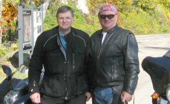 Here, these two stylish riders stopped for a break along the Blue Ridge Parkway to model their high-tech synthetic (left) and leather jackets.